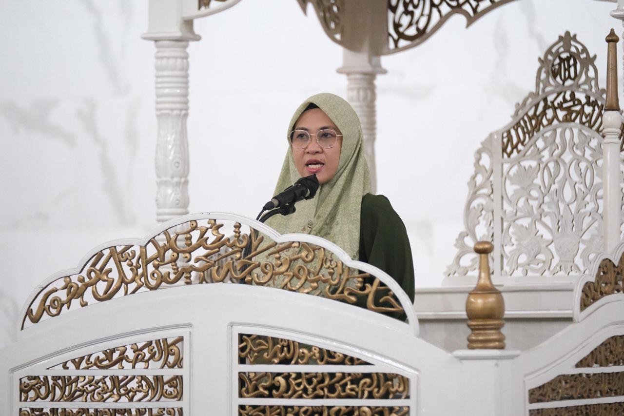 Bupati Gowa Hj Sitti Husniah Talenrang memberikan sambutan usai pelantikan dirinya sebagai Ketua DMI Gowa. --foto/humas gowa--