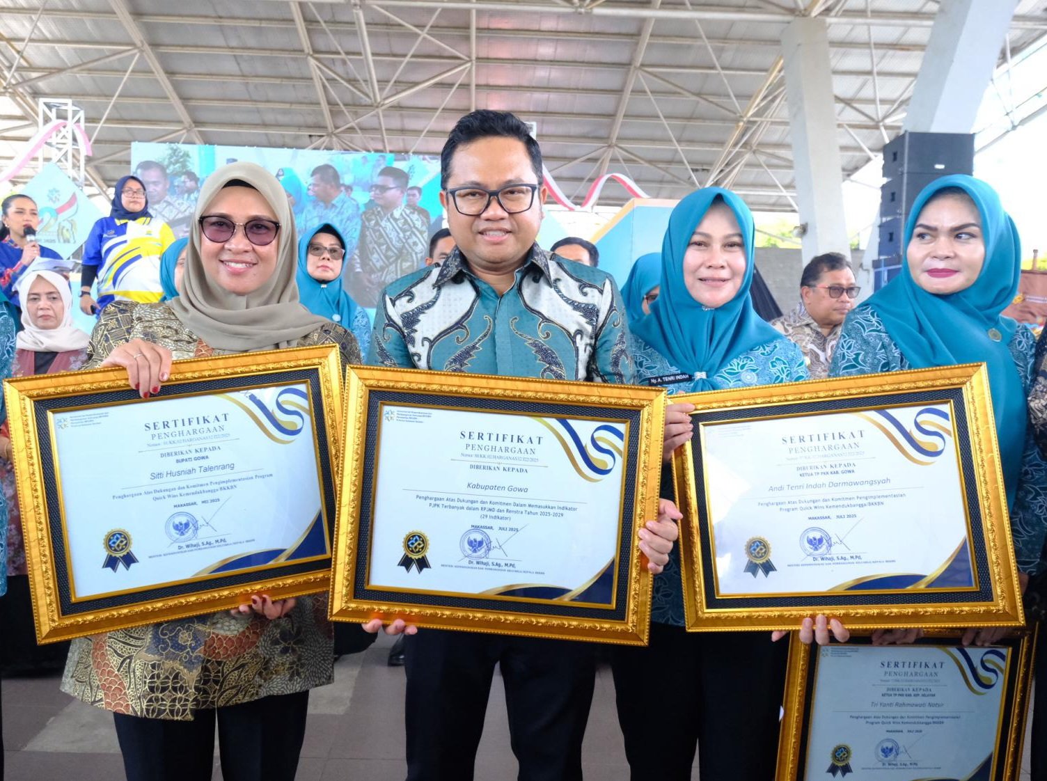 Bupati Gowa Husniah Talenrang dan Wakil Bupati Gowa Darmawangsyah Muin saat menerima penghargaan. --foto/humas gowa--